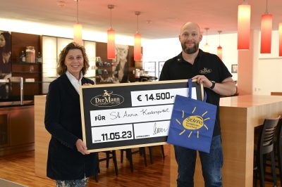 Die Bäckerei DerMann konnte im Rahmen ihrer Zimtschnecken-Aktion für krebskranke Kinder eine Summe von insgesamt 14.500 Euro erzielen. Bäckermeister Michael Mann freute sich den Spendenscheck an die St. Anna Kinderkrebsforschung zu übergeben.