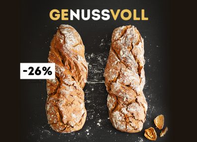 Vom 23.02 – 08.03 erhalten Sie 26 % Rabatt auf unser Nussbrot. Geniessen Sie die süsse Köstlichkeit um nur € 3,36 statt € 4,55!