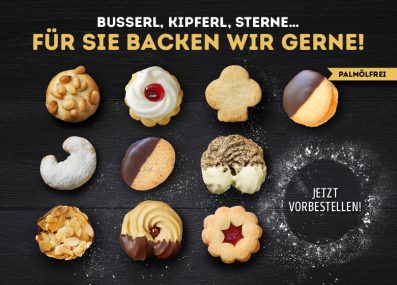 Ebenfalls im 250g Karton erhältlich: Butterhauskekse, Schokokipferl und Pignolie. Freuen Sie sich ausserdem auf unsere Dotterbusserl und Nusskekse im 300 g Karton.