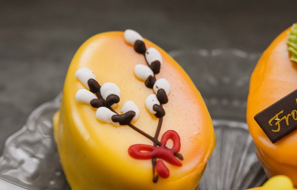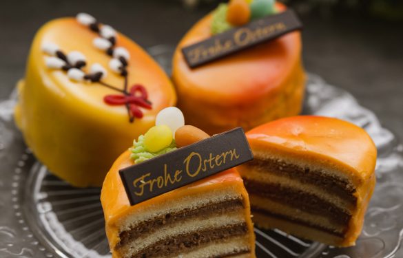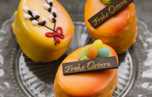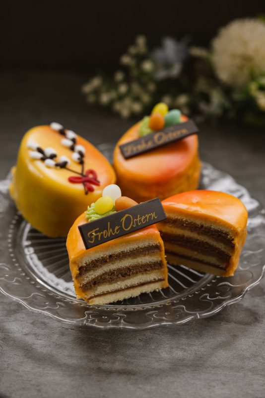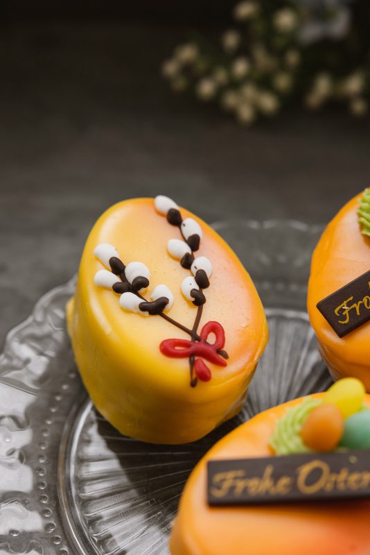 Ein feines Biskuit mit Himbeermarmelade und Schokoladecreme gefüllt, mit Fondant glasiert und mit österlichem Dekor versehen.