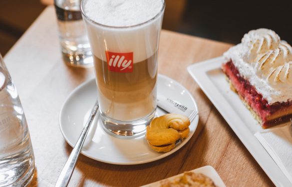 Heiss geschäumte Milch mit einem illy Espresso, serviert im Glas.