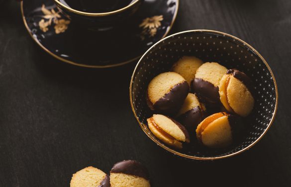 Mürbe Weihnachtskekse mit hohem Dottergehalt und Marillenmarmelade und mit Schokolade filiert.