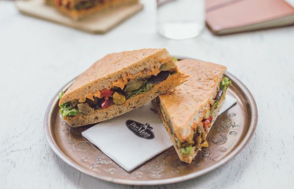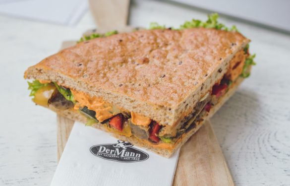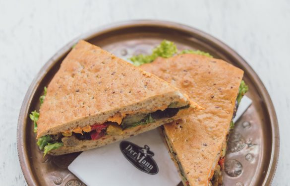 Luftige Brotflade, gefüllt mit Hummus-Aufstrich, Lollo-Salat, sowie einer Gemüsemischung bestehend aus Gemüsepaprika, Zucchini und Aubergine, die in Olivenöl und einer Kräutermischung angebraten wurde