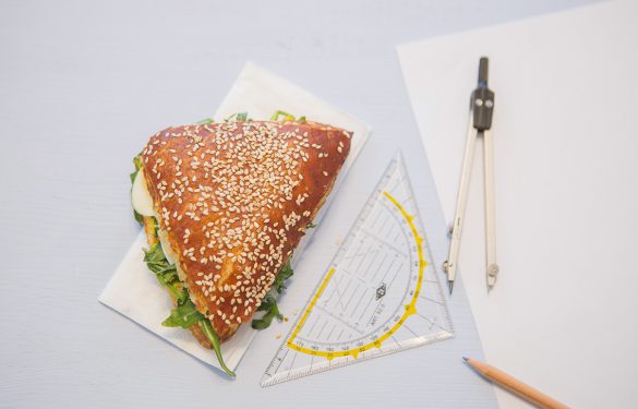 Für diesen Imbiss, der vor allem für das zweite Frühstück ideal ist, backen wir ein mit Sesam bestreutes Butterplundergebäck in Dreiecksform, das wir mit Eiaufstrich und Eischeiben füllen, mit Rucola belegen und mit Schnittlauch garnieren. Ein Geschmackserlebnis!