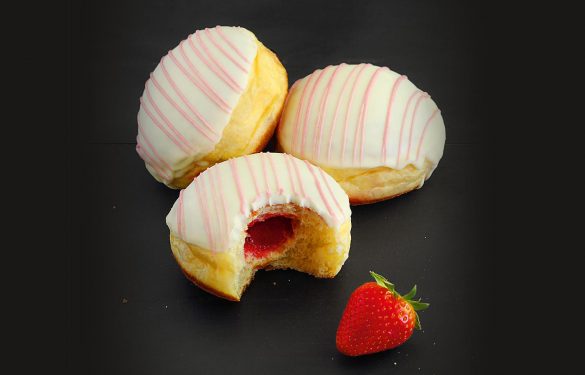 Flaumiger Krapfen gefüllt mit frisch gekochter Erdbeerfüllung, glasiert mit weisser Schokomasse und verziert.