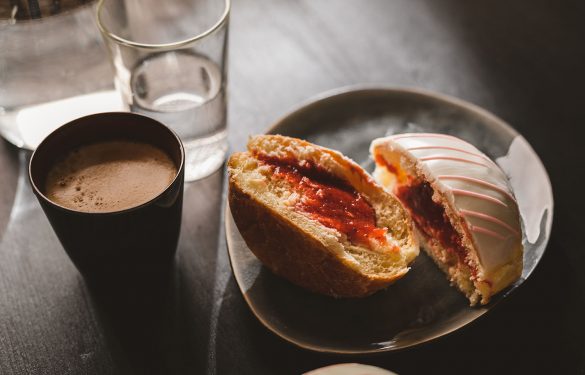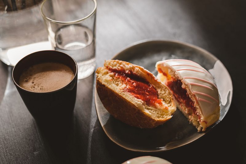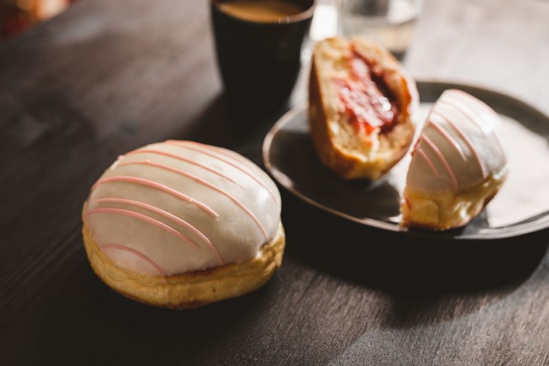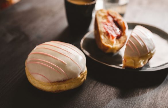 Flaumiger Krapfen gefüllt mit frisch gekochter Erdbeerfüllung, glasiert mit weisser Schokomasse und verziert.