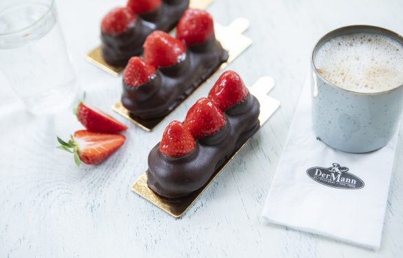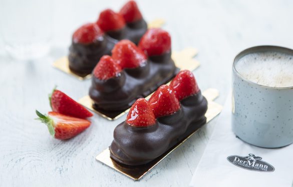 Frische Erdbeeren auf einem herrlichen Makronengebäck, teilweise überzogen mit Schokolade.