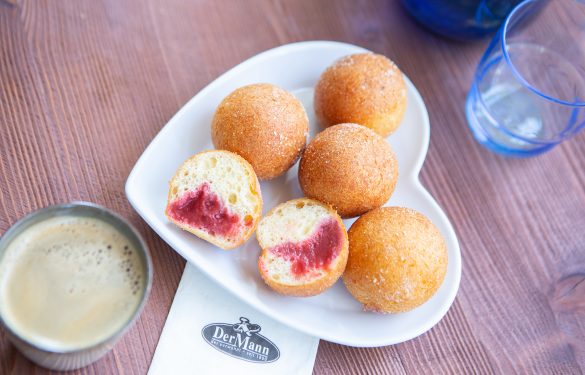 Feinster Topfenteig in Bällchenform wird mit köstlicher Himbeerfülle gefüllt und mit Mandelgriess und Vanillezucker gerollt.