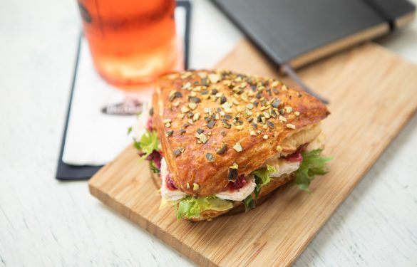 Laugenpolster in Dreickform bestreut mit Kürbiskernen, gefüllt mit Frischkäse und knackigem Salatmix. Belegt mit würzigem Weichkäse in Kombination mit süssen Wildpreiselbeeren.