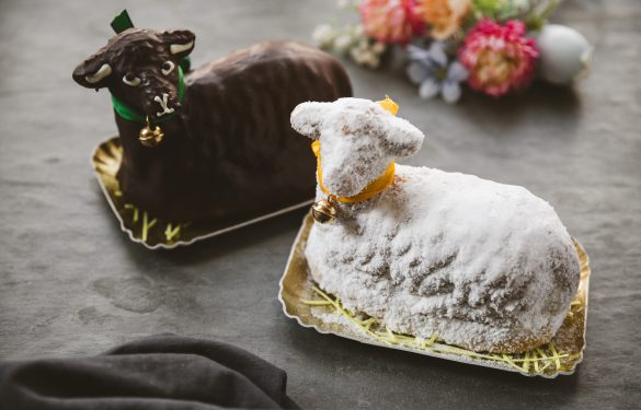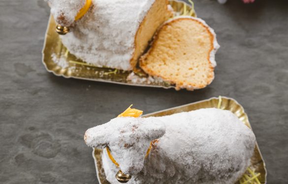 Das Kokoslamm besteht aus einer saftigen Sandmasse in Lammform mit Kokosraspel überzogen.
