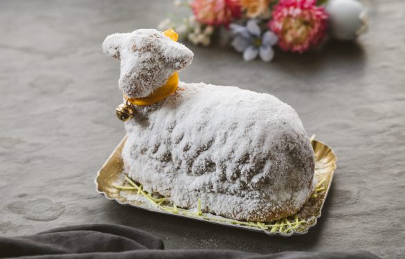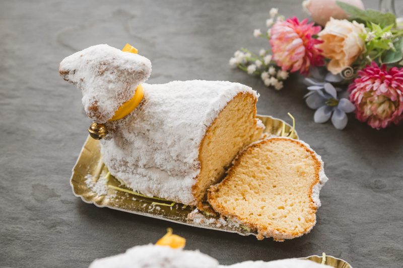 Das Kokoslamm besteht aus einer saftigen Sandmasse in Lammform mit Kokosraspel überzogen.