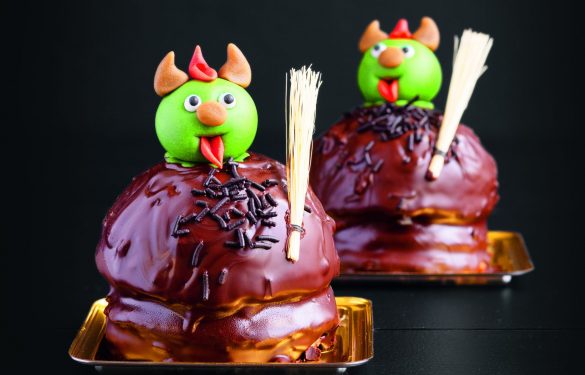 Mürbteig mit Nüssen als Boden und eine Biskuitmasse als Körper. Dieser ist gefüllt mit Nougatcreme und Weichselfruchtfüllung. Überzug aus Schokolade, dekoriert mit Schokostreusel und einem Kopf aus Marzipan.