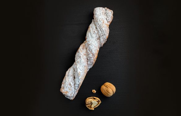 Zarter Butterplunder wird mit einer hervorragenden Nussfüllung bestrichen und zu einem Stangerl gedreht. Nach dem Backen wird das Nussstangerl mit Staubzucker dekoriert.