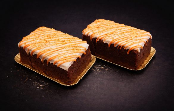 Zarter, flaumiger Orangenkuchen mit frischen Orangenfruchtfleisch und natürlichen Aromen. Überzug Zucker- Orangenglasur bestreut mit Haselnusskrokant.