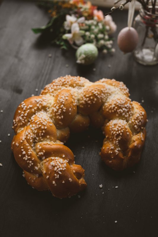 Dieses österliche Brauchtumsgebäck wird aus einem feinen Hefeteig, der wie ein Striezel geflochten und zu einem Kipferl geformt wird erzeugt.