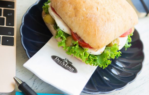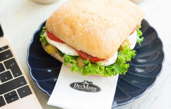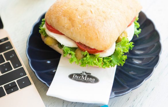Flaumiges Ciabattakissen mit Mozzarella, ital. Kräutern, Oliven, Tomaten und Lolo Salatgefüllt.