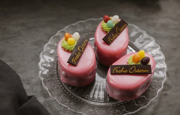 Punschkrapfen in Ei-Form österlich dekoriert.