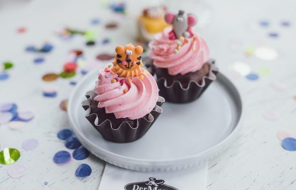 Muffin aus heller Sandmasse mit Milchschokoladenstücken, darauf eine leichte Buttercreme mit Himbeergeschmack.