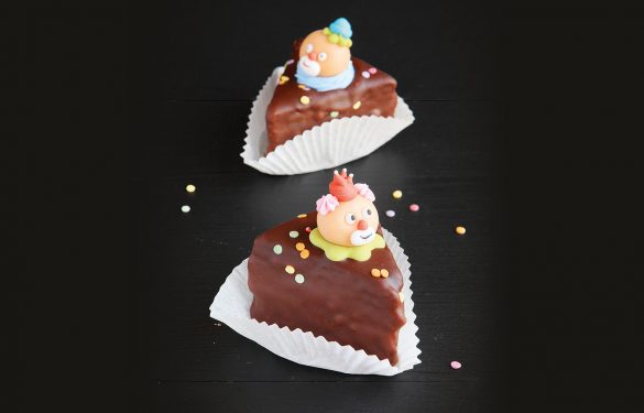 Feines Kakaobiskuit mit reichlich Marillenkonfitüre und Nougatoberscreme gefüllt und mit Schokofondant glasiert. Lustige Clownköpfe dienen als Dekoration.