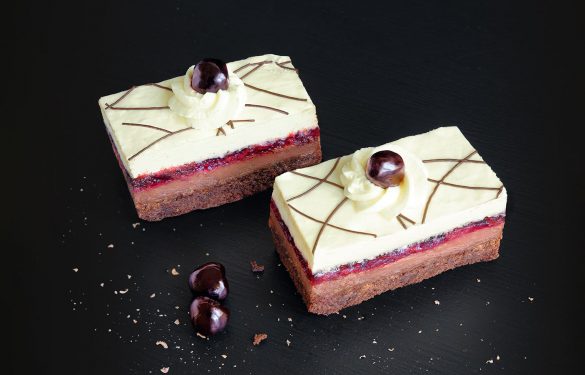 Eine Kombination aus einem Schokoboden, gefüllt mit luftiger Schokocreme, Vanillecreme, Kischfülle und einer knackigen Crunchfülle. Dekoriert mit Schokolade, Rosette und einer Amarenakirsche als Krönung.