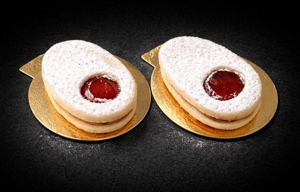 Keks aus Buttermürbteig in Spiegeleiform gefüllt mit Marillenmarmelade & Dekorzucker abgestaubt.