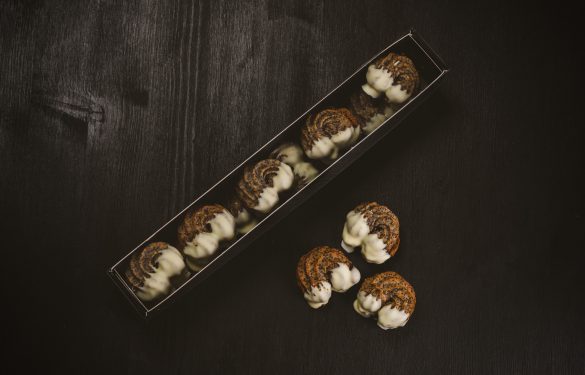 Linzerteig mit Waldviertler Graumohn und Himbeermarmelade gefüllt. An den Enden in weisse Schokolade getaucht.