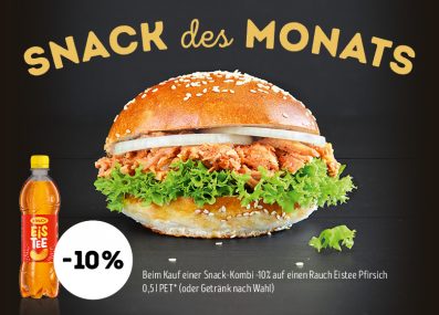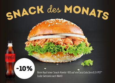 Diesen Monat gibt es den Pulled Pork Burger als Snack-Kombination mit 10% Rabatt – zugreifen lohnt sich.